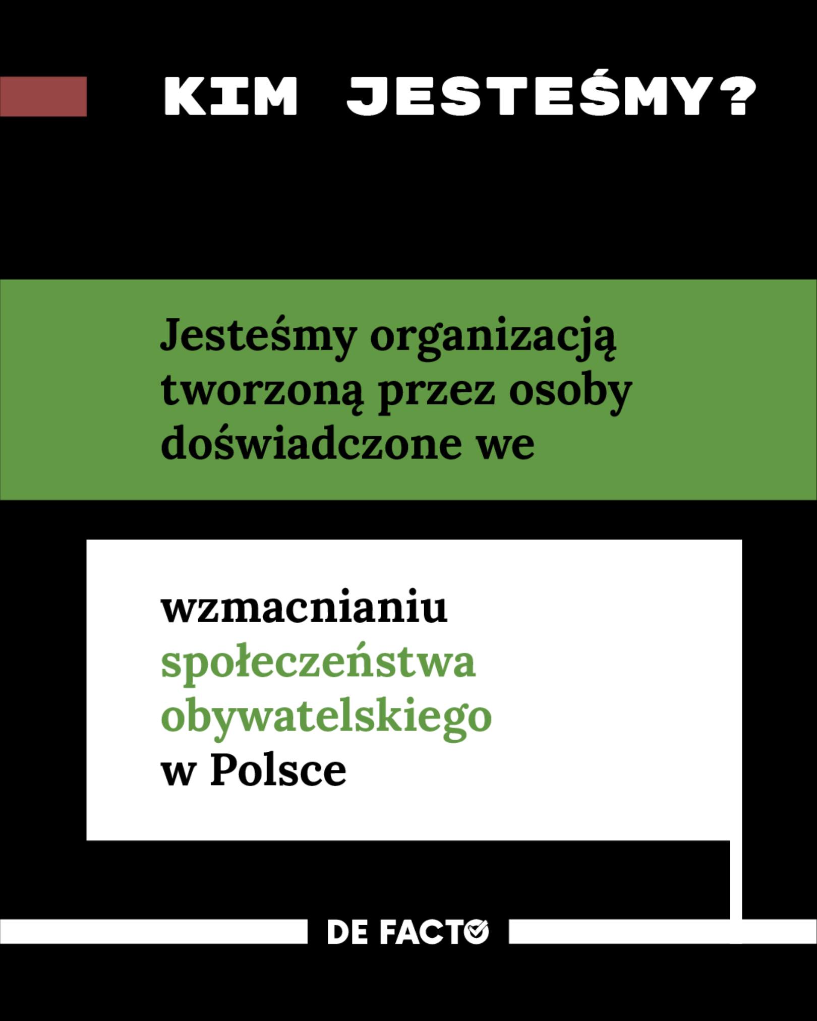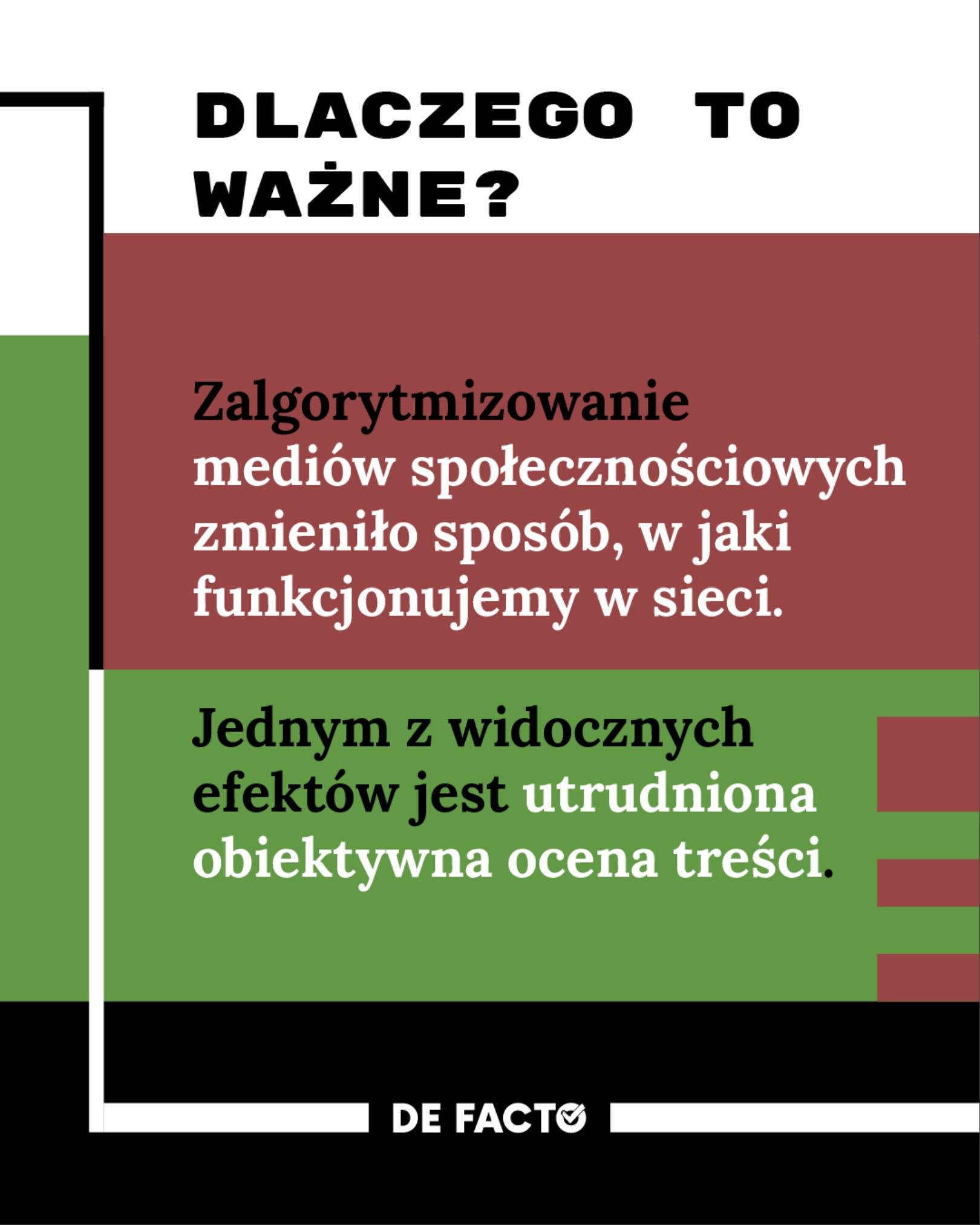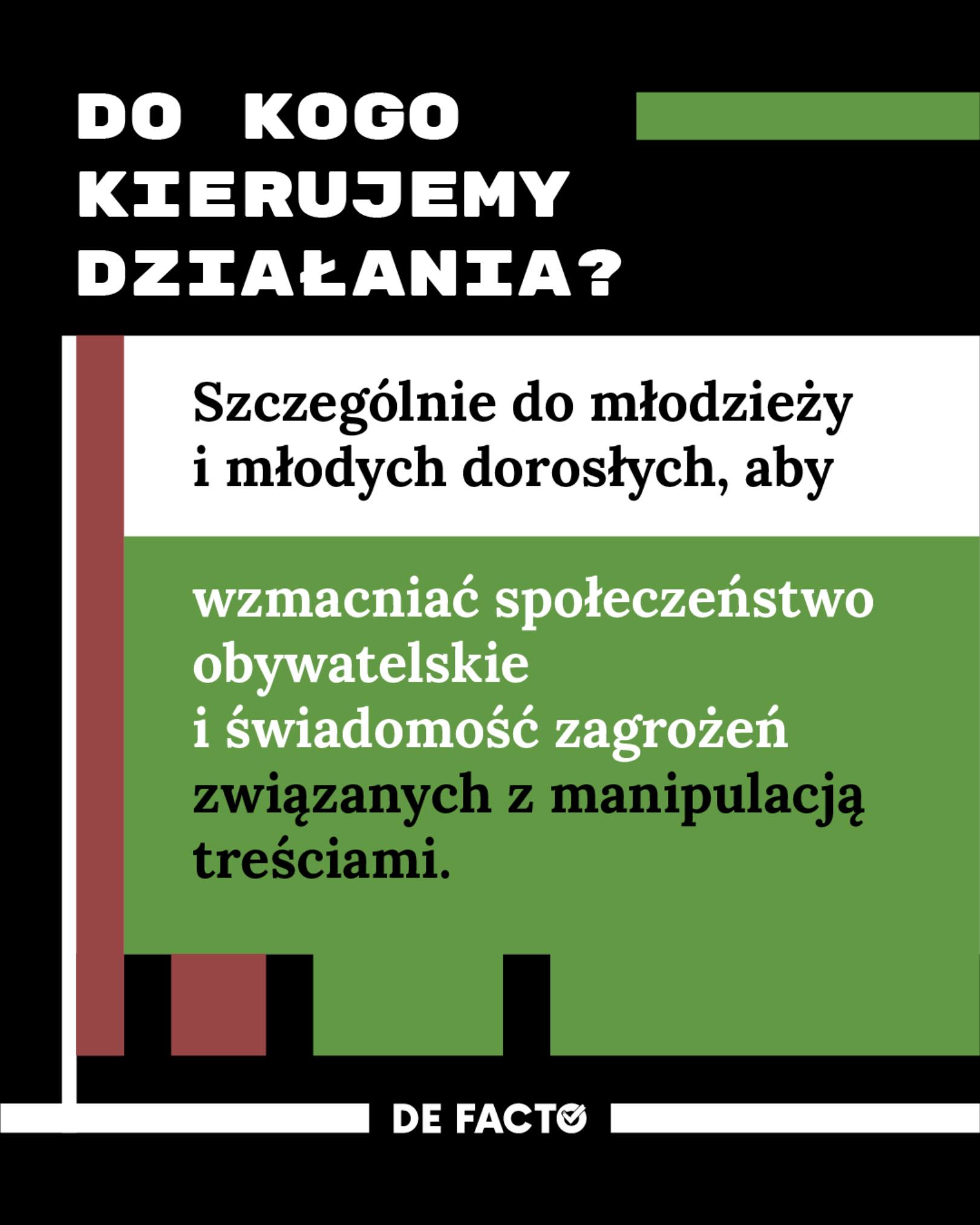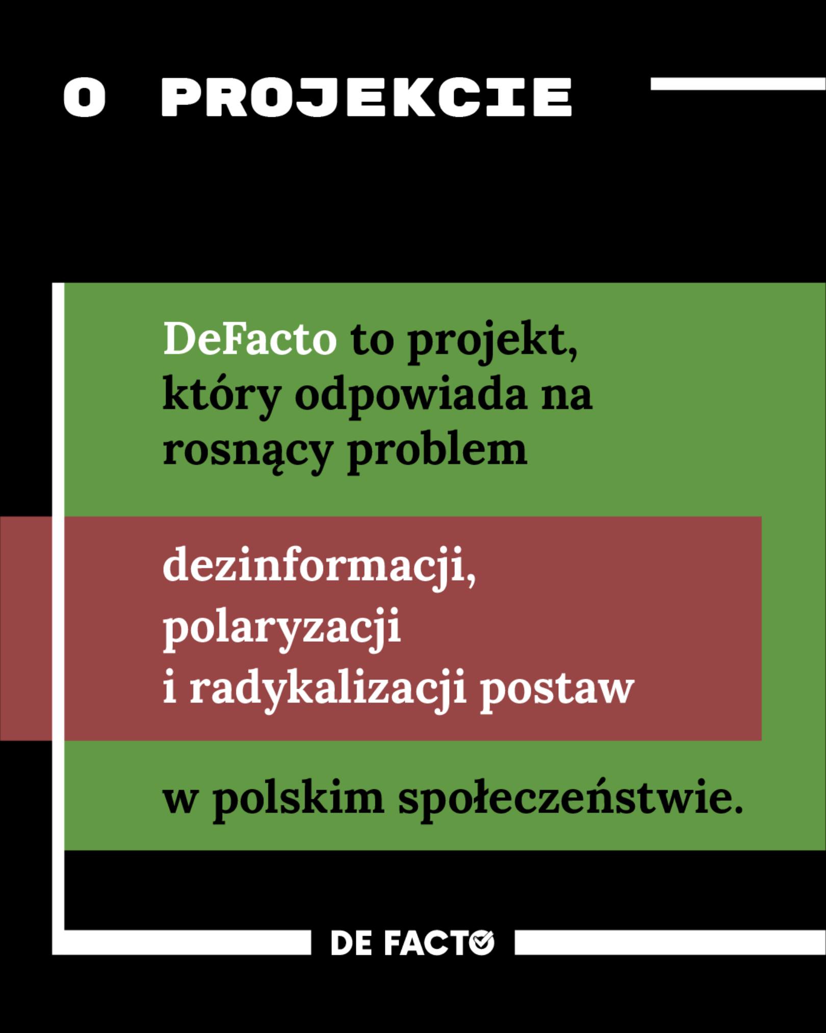 Fundacja De Facto Polska to oddolna odpowiedź na wzrost zagrożeń związanych ze zjawiskiem dezinformacji, radykalizacji i polaryzacji. W centrum naszej uwagi jest dezinformacja rozpowszechniana za pośrednictwem mediów społecznościowych, a nasze działania kierujemy przede wszystkim do młodzieży i młodych dorosłych.
